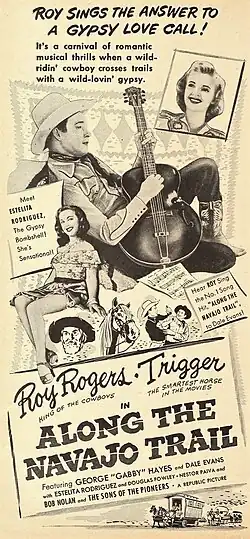 Along the Navajo Trail is a 1945 American Western film directed by Frank McDonald and starring Roy Rogers, Gabby Hayes and Dale Evans. The film's story was based on a William Colt MacDonald novel. The film marked the debut of the Cuban actress Estelita Rodriguez, who Republic Pictures then began to build up into a star. Its title song is Along the Navajo Trail, an instrumental version of which appears with the opening credits, with a brief vocal version during the last twenty seconds of the film. The first few bars of the song are used as background music in several chase scenes.[1]