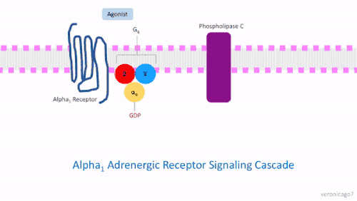 The structure of α receptors is a classic G protein–coupled receptors (GPCRs) consisting of 7 transmembrane domains, which form three intracellular loops and three extracellular loops.[2] These receptors couple to heterotrimeric G proteins composed of α, β, and γ subunits.[2] Although both of the α receptors are GPCRs, there are large differences in their mechanism of action. Specifically, α1 receptors are characterized as Gq GPCRs, signaling through Phospholipase C to increase IP3 and DAG, thus increasing the release of calcium. Meanwhile, α2 receptors are labeled as Gi GPCRs, which signal through adenylyl cyclase to decrease cAMP.[38]