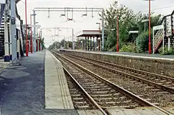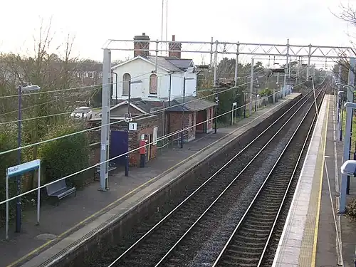 Alresford railway station is on the Sunshine Coast Line, a branch of the Great Eastern Main Line, in the East of England, serving the village of Alresford, Essex. It is 57 miles 63 chains (93.0 km) down the line from London Liverpool Street[1] and is situated between Wivenhoe to the west and Great Bentley to the east. In official literature it is shown as Alresford (Essex) in order to distinguish it from the station of the same name in Hampshire. Its three-letter station code is ALR.