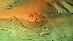 The fortification lies on the southeastern edge of a broad, east-west oriented hill ridge in the forested area of Altenburg.[4] The east and south sides of the site drop fairly steeply to the valley floor of the Hirtenbach stream which lies at around 80 metres above sea level. To the west of the fortifications is a terrain saddle. The north side transitions almost on the level into the hill ridge. The two vulnerable sides, in the west and north, were protected by what is now a very low semi-circular rampart guarded by a ditch. The western end of the rampart transitions into a step in the terrain on the hillside. The rampart still has a height of up to 1.3 metres and a width of five metres; the ditch is the same width. The height difference between the floor of the ditch and crest of the rampart is 1.7 metres. About 25 metres behind the rampart, a second parallel stone rampart was built; it too is very low today. The inner rampart has no visible link to the outer one at the edge of the defensive position. In the west and north there are gaps in the rampart; the ditch has also been levelled at these points. These entry points have probably been created relatively recently.