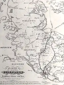 The English engineer George W. Buck was commissioned to plan the route. He came to the conclusion that in order to avoid hills the line should not pass through Segeberg but should instead run via Barmstedt and Neumünster. As a result of the influence of Klaus Panje, Elmshorn offered to increase its shares in the enterprise if the line took a more westerly course, which a general meeting of the company agreed to in May 1842. Christian VIII issued the company a license for the line on 28 June 1842. The line’s termini would be built close to the respective ports. In the plan of 1844, other stations would be built in Pinneberg, Tornesch, Elmshorn, Wrist, Neumünster and Bordesholm; and there would be halts in Stellingen, Eidelstedt, Halstenbek, Priesdorf, Horst, Dauenhof, Siebenecksknöll, Brockstedt, Pahdenstedt, Fohrde and Meimersdorf.