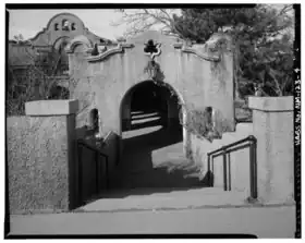 The Alvarado was a sprawling, three-story building designed in the Mission Revival style. It was situated at the corner of First Street and Central Avenue, at the northern end of a four-block complex of railroad buildings that also included the Santa Fe Depot, the still-extant Freight House (1946), Curio Store (1912), and Telegraph Office (1914), and several others.[18] It was of wood-framed construction with tiled roofs and a rough, gray stucco exterior applied to a layer of steel lath.[13] The main hotel block was E-shaped with three protruding wings, each with a curved Mission-style gable, fronting on the adjoining railroad tracks. Two interior courtyards between the wings of the hotel were enclosed by arcades which also connected to the Indian Building, depot, and other outbuildings. A pediment with a curved gable flanked by two stepped towers marked the main entrance of the hotel.
