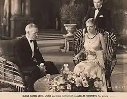 Always Goodbye is a 1931 American pre-Code drama film directed by Kenneth MacKenna and William Cameron Menzies and starring Elissa Landi, Lewis Stone and Paul Cavanagh.[1] It was produced and distributed by Fox Film.