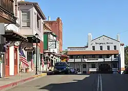 The former Amador County Courthouse consists of two buildings: the second courthouse (built 1864) and the Hall of Records (1893), that were enclosed and combined in 1939 with an Art Deco exterior.[7]