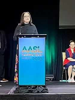 ![]() Amanda Jones accepting the AASL Intellectual Freedom award in 2023 | |