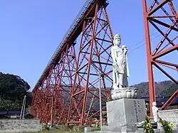 Work began on the original bridge in December 1909, and it opened for service March 1, 1912.[1] It was 310.59 meters (1,019.0 ft) in length and 41.45 meters (136.0 ft) tall, constructed at a cost of 331,535 yen. It had 11 vertical supports and 23 sections of girders and National Route 178 passed beneath it. The structure's unique design and bright color made it popular not only with rail fans but tourists as well. The closest station is Amarube Station, and the mountain behind it provides a popular point from which photographers take pictures of the bridge. From March 6, 2008, the bridge was closed periodically for the construction of its replacement.