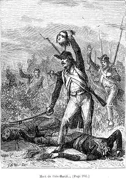 The Republicans having been informed that he would be in his castle in Villehemet on 15 June 1795, a company of grenadiers marched to surprise him there. He was due to get married on the night of 16-17 June. He was betrayed by a young man he had taken in. Boishardy realised the betrayal too late; he wanted to flee: the grenadiers pursued him with rifle shots; he was hit and finished off with sabre blows by two soldiers on the road from Bréhand to Moncontour, near the Saint-Malo chapel (a calvary, called the Croix de Boishardy, still marks the place today) in the presence of his young friend Anne Joséphine Quentin de Kercadio. His bloody head, separated from his body, was paraded through the streets of Lamballe and Moncontour then thrown into the Launay pond. The two assassins were very lightly punished. Later, the pond was drained and Boishardy's skull was found; it now rests in the Maroué cemetery.