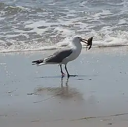 It has a varied diet, including marine invertebrates such as mussels, crabs, sea urchins, and squid; fish such as capelin, alewife, and smelt; insects; and other birds including their chicks and eggs. It often feeds on carrion and human refuse. Food is plucked from the surface of the shore or sea or is caught by dipping underwater or by shallow plunge-diving.[9] They also feed on clams and mussels by dropping them from a height on hard surfaces such as roads or rocks to break their shells. There is some question about whether this behavior is learned or innate, although it seems to be learned.[18]
