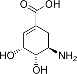 Aminoshikimic acid is an unnatural carbohydrate, although aminoshikimic acid is the namesake of the aminoshikimate pathway, which generates the 3-amino-5-hydroxybenzoic acid (AHBA) starter unit required for the biosynthesis of the ansamycins and mitomycins.[1] The first microbe-catalyzed syntheses of aminoshikimic acid were described by Guo and Frost in 2004.[2]