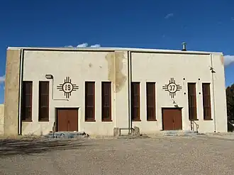 The Amistad Gymnasium is a historic gymnasium located in Amistad, New Mexico. The gymnasium was proposed in 1935 by the Works Progress Administration; construction was completed in 1937. The WPA built many gymnasiums in rural New Mexico during the Great Depression, as these projects provided jobs and a community meeting place to residents. The gymnasium in Amistad was no different, as it created roughly 50 construction jobs and hosted community dances, gatherings, and sporting events. The building has a Pueblo Revival style design with Art Deco influences, reflecting the WPA's tradition of incorporating local styles into modern designs. Two Zia sun symbols on the front of the building denote its year of completion.[2]