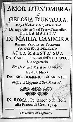 Queen Maria Casimira had taken up residence in Rome in 1699 following the death of her husband Jan III Sobieski and her subsequent exile from Poland. Once in Rome she set up a court and became an active figure the city's musical life. In 1709, Domenico Scarlatti succeeded his father Alessandro as her court composer. His librettist, Carlo Capece, was her private secretary and court poet. Amor d'un'ombra e gelosia d'un'aura premiered at Maria Casimira's private theatre in the Palazzo Zuccari in January 1714 and proved to be the last of the several operas which Scarlatti had composed for her. Five months after the premiere, she departed for France, leaving a string of debts behind her.[2]