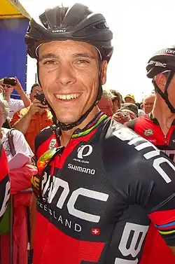 From 2003 to 2016, the finish was shortly after the top of the Cauberg climb in Valkenburg. Kazakh rider Alexander Vinokourov won the first uphill-finish edition with an attack before the Cauberg.[10] In 2013 the finish was moved 1.8 km away from the top of the Cauberg, near the centre of Valkenburg, resulting in a mainly flat, straight finish.[11] In 2017 the race organisers moved the finish so that the final climb of the Cauberg came 19 km from the finish, hoping for a "more open" race.[12] The most successful rider in recent years has been classics specialist Philippe Gilbert. The Belgian won the race four times between2010 and 2017, basing his victories on late bursts of speed and power on the Cauberg.[13] Therefore, earned the nickname of ‘Mister Cauberg’ and ‘Amstel Gilbert Race’ came up. In 2015 Polish rider Michał Kwiatkowski became the first reigning world champion to win the race since Bernard Hinault in 1981.[14][15][16] Kwiatkowski won again seven years later, when he outsprinted Benoît Cosnefroy in the finish of the 2022 edition.[17]