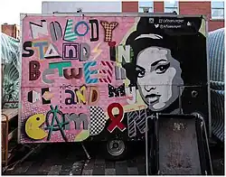 Many musical artists have since paid tribute to Winehouse including Nicki Minaj,[61] M.I.A., Lady Gaga, Kelly Osbourne, Rihanna,[62] George Michael, Adele, Dita Von Teese,[63] Courtney Love,[64] and the rock band Green Day, who wrote a song in her tribute titled "Amy".[65] In her 2012 album Banga, singer Patti Smith released "This Is the Girl", written as an homage to Winehouse.[66] Mark Ronson dedicated his UK number-one album Uptown Special to Winehouse, stating: "I'm always thinking of you and inspired by you."[67] In February 2019, Salaam Remi released a compilation album including the song "Find My Love" which is a posthumous collaboration between Winehouse and rapper Nas.[68]