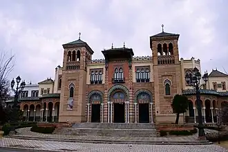 Aníbal González was appointed chief architect of the Sevilla Iberoamerican Exposition of 1929, where he worked until 1926.[3] He designed in the Plaza de América of Maria Luisa Park, the Mudéjar Pavilion that was accomplished in 1914 (currently Museum of Arts and Traditions of Sevilla),[4] the Palacio del Renacimiento (currently Archeological Museum of Seville) and the Real Pavilion. His most famous work for the Exposition is the Plaza de España, completed in 1929 that was the most emblematic place of this event. González combined a mix of 1920s Art Deco and 'mock Mudejar', and Neo-Mudéjar styles. The Plaza de España complex is a huge half-circle with buildings continually running around the edge accessible over the moat by numerous beautiful bridges. In the centre is a large fountain. By the walls of the Plaza are many tiled alcoves, each representing a different province of Spain.[5]