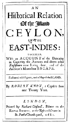 An Historical Relation of the Island Ceylon is a book written by the English trader and sailor Robert Knox in 1681. It describes his experiences some years earlier in the Kingdom of Kandy, on the island today known as Sri Lanka. It provides one of the most important contemporary accounts of 17th century Sri Lankan life.