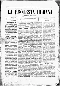 During this time the Argentine anarchist movement was split over the question of organization. There was a, mostly communist anarchist, wing advocating workers' organizations, deeming them the natural weapon for the anarchist struggle. The opponents of organizations, both communist and individualist anarchists, in turn claimed organizations forced those working within them to become reformists and give up their revolutionary stance. Until his departure in 1889, Malatesta helped bridge this gap and minimize the tensions and rivalries between the two wings, but after he left, they broke out once again.[7] The pro-organizers were strengthened in 1891 by the arrivals of the Spanish anarchist Antoni Pellicer in 1891 and the Italian Pietro Gori in 1898. In 1897, the proponents of trade unions also founded the weekly newspaper La Protesta Humana. In 1900, Paraire published a series of articles in La Protesta Humana under the title "Labor Organization" advocating a dual organization concept: a militant labor federation for economic, and a genuinely anarchist organization for political matters.[2] Other works of writing regarding anarchist activities were also published around this time. La Voz de la Mujer was an anarcha-feminist newspaper founded in Argentina in 1896 that was the first of its kind. It was dedicated to defending anarchist communism from a feminist perspective. Early figures of the anarchist movement, such as Virginia Bolten, were said to have contributed to the newspaper. Her acclaimed skills as a speaker helped to push the ideas of anarcha-feminism and anarchist communism to the frontline of the anarchist movement in the early years.[8]