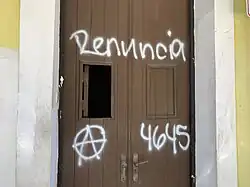 Among the more militant sector of anarchism, American democracy was treated as fraudulent and as a refuge for the affluent, calls were made not to participate in the elections.[195] As the support for the United States grew among the working class, Juan José López cautioned against it by citing incidents such as the Haymarket affair and its ramifications, Tampa cigar makers' strike and the confrontations between the federal government and the Industrial Workers of the World, the case of Simón Radowitzky, among other examples against the ideas of Republic-based democracy.[196] He criticized the colonial administration for employing the police to counter strikes and called those that still believed in the American flag and constitution "fools", insinuated that the working class leaders had become tools and only served to discredit the class struggle.[197]