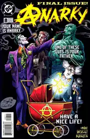 Taking place after the No Man's Land story arc, Lonnie Machin decides to finally confront his supposed biological parents to uncover the truth of his lineage. He first meets with his alleged biological mother, Greta Mitchell, but finds that she is mentally unbalanced, due to the side effects of Joker venom she was exposed to years earlier. In a flashback, she tells the story of how she became pregnant by the Joker, and that due to her condition she was deemed unfit for parental responsibility and that her child was taken away from her. However, Lonnie is unable to get any more information from her. As a final recourse, Anarky breaks into Arkham Asylum using his teleporter and confronts his alleged father, now revealed to be the Joker. Meanwhile, the Joker is in the midst of a prison break with other inmates, and takes advantage of the situation to steal the teleporter, and then forces Anarky to participate. Unarmed, Anarky plays along until he manages to regain the teleporter to escape, without the Joker having given him any clear answers either. Although the story presents no evidence, Anarky asserts that he personally believes the Joker is his father, and fears that someday he may become insane as well.[40]