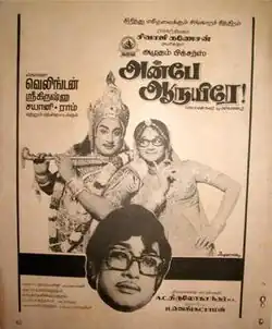 Anbe Aaruyire (transl. Darling) is a 1975 Indian Tamil-language romantic comedy film, directed by A. C. Tirulokchandar. The film stars Sivaji Ganesan and Manjula. It was released on 26 September 1975.[1] The film is a remake of the 1967 Telugu film Gruhalakshmi.