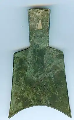 - Prototype spade money: This type of spade money is similar in shape and size to the original agricultural implements. While some are perhaps robust enough to be used in the fields, others are much lighter and bear an inscription, probably the name of the city which issued it. Some of these objects have been found in Shang and Western Zhou tombs, so they date from c. 1200–800 BC. Inscribed specimens appear to date from c. 700 BC.[1]: 5