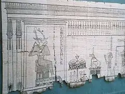 The design and scale of Egyptian burial tombs varied from period to period, even though their function remained the same. While most tombs were built during the lifetime of the person it was meant for, Egyptian tombs were constructed to house the body of the dead, but also functioned to transmit the soul to the underworld.[4] Most of what was found in a tomb depended on the status of the person buried within it. However, in order to assist the dead, most tombs were decorated with texts meant to help guide the deceased's soul to the afterlife, something that was attainable to all.[5] It was believed that a false door was a threshold between the worlds of the living and the dead and through which a deity or the spirit of the deceased could enter and exit.[6] Pharaohs' tombs were provided with vast quantities of wealth. Grave goods and treasury are usually personal possessions, supplies to smooth the deceased's journey into the afterlife or offerings to the gods.