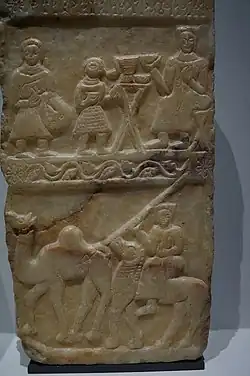 Sabaean alabaster grave stele of ʿIglum, son of Saʿad Illat Qaryot with two scenes of the deceased (Louvre)