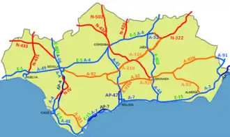 - ^ a b Pozuelo, I. (2003). "Los sistemas de trasporte, las infraestructuras y el territorio". Geografía de Andalucía (Coor. López Antonio) (in Spanish). Barcelona: Ariel Geografía. ISBN 84-344-3476-8.
