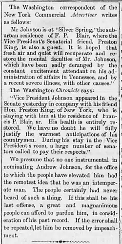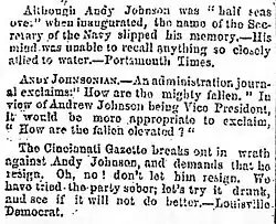 - ^ "The Vice President's Critics". The Selinsgrove Times-Tribune. Selinsgrove, Pennsylvania. March 31, 1865. p. 1. Retrieved 2023-07-08.