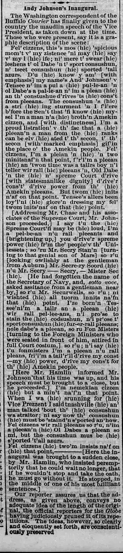 Fel' cizzens, this 's mos (hic) 'spicious mom't v' my zistence 'ni may (hic) say v' my l (hic) ife; ni' mere t' swear (hic) leshens t' ol Dabe 'nt' sport consushun, n' tseet consushun (hic) sported 'tall azurs. D'u (hic) know y am' [with emphasis] my name's And' Johnson' v Tensee n' im a pul a (hic) pul-le-an 'n ol Dabe's a pal-le-an n' im a plean (hic) an th' constushue d'rives 'ts (hic) cons't from pleeans. The consushun 's (hic) a stri (hic) ing sturment 'n I f'l'ere b'fore the Sen't that 'fi know (hic) my-sel I'm a man n'a (hic) broth'n Amekin cizzen, and [with distinctness] I'm a proud listration' v th' fac that a (hic) pleean'n a man from the (hic) ranks can be elv (hic) ated t' th' secon, t' th' secon [with marked emphasis] gif'in the place o' the Amekin people. Fel' cizzens, I'm a pleian 'n (hic) 'n two minitsnaf'n that point, f'r'i'm a pleean (hic) an 'twon time was a tailrs boy n'i teller wir rail (hic) pleeans 'n, Old Dabe 'n the (hic) n' spreme Court d'rive [with statesmanlike dignity] d'rive'r cons't' d'rive power from th' (hic) Amekin pleeans. But twom (hic) inits'naf on that point. Tensee's allers been loy'l'ni (hic) glore'n dressing my fel' twom inits'naf on that (hic) point.[71]
