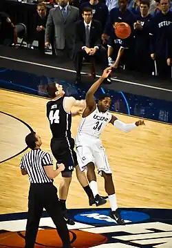 During his sophomore year, Smith played in all 38 games, starting 32.[2] After Butler got off to a mediocre 3–2 start, Smith was added to the starting lineup.[1] Against Cleveland State, he scored a career-high 22 points and collected 10 rebounds to get his first collegiate double-double. In the final game of the regular season, he played a career-high 36 minutes and recorded 11 rebounds, 3 steals, and 3 blocks, all career highs.[2] Thanks in large part to Smith's emergence as a starter, Butler returned to the NCAA Tournament.[4] During the round of 32, Smith hit a go-ahead basket with less than 3 seconds on the clock to help Butler beat top seeded Pittsburgh.[2] In Butler's sweet 16 match against Wisconsin, Smith hurt his ankle and left the game.[4] However, he returned before the game's end, collecting eight points and six rebounds as Butler advanced to the regional final.[4] Butler again advanced to the Championship game. Smith led the team in rebounding in the regional final against Florida and in the National Championship game against Connecticut.[2] He finished the year as the team's second-leading rebounder (5.6 per game) and third-leading scorer (8.5).[2][7] He made 59.3% of his field goal attempts and 67.3% of his free throws.[7]