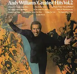 Andy Williams' Greatest Hits Vol. 2 is a compilation album by American pop singer Andy Williams that was released in June 1973 by Columbia Records.[4] This collection follows in the footsteps of its predecessor, Andy Williams' Greatest Hits, in that it is not limited to his biggest and most recent hit singles, although his final two US Top 40 entries ("(Where Do I Begin) Love Story" and "Speak Softly Love (Love Theme from 'The Godfather')") were included.[6] It also has an album track not released as a single ("The Impossible Dream (The Quest)"), a couple of hits from his time with Cadence Records ("Lonely Street" and "The Village of St. Bernadette"), two other singles that could have been included on the first volume ("In the Arms of Love" and "Music to Watch Girls By"), and two Easy Listening chart entries that never made the Billboard Hot 100 ("Home Lovin' Man" and "Music from Across the Way").[6][7]
