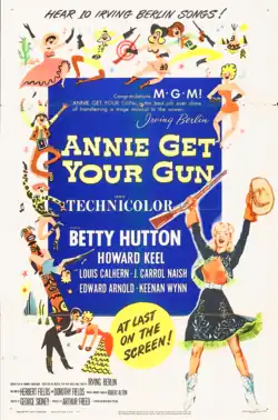 Annie Get Your Gun is a 1950 American musical Technicolor comedy film loosely based on the life of sharpshooter Annie Oakley. The Metro-Goldwyn-Mayer release, with music and lyrics by Irving Berlin and a screenplay by Sidney Sheldon based on the 1946 musical, was directed by George Sidney. Despite several production and casting problems (Judy Garland was fired from the lead role after a month of filming in which she clashed with the director and repeatedly showed up late or not at all), the film won the Academy Award for Best Scoring of a Musical Picture and received three other nominations. Star Betty Hutton was recognized with a Golden Globe nomination for Best Actress.