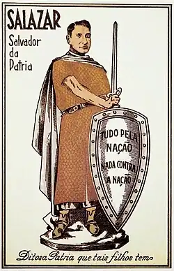 Opposed to communism, socialism, syndicalism and liberalism, Salazar's rule was conservative, corporatist and nationalist in nature; it was also capitalist to some extent although in a very conditioned way until the beginning of the final stage of his rule, in the 1960s.[5] Salazar distanced himself from Nazism and fascism, which he described as a "pagan Caesarism" that did not recognise legal, religious or moral limits.[6] Throughout his life Salazar avoided populist rhetoric.[7] He was generally opposed to the concept of political parties when, in 1930, he created the National Union. Salazar described and promoted the Union as a "non-party",[8] and proclaimed that the National Union would be the antithesis of a political party.[8] He promoted Catholicism but argued that the role of the Church was social, not political, and negotiated the Concordat of 1940 that kept the church at arm's length. One of the mottos of the Salazar regime was Deus, Pátria e Família ("God, Fatherland and Family"), although Catholicism was never the state religion.[9][10] The doctrine of pluricontinentalism was the basis of Salazar's territorial policy, a conception of the Portuguese Empire as a unified state that spanned multiple continents.