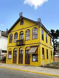 One of the city's most well-known houses and the first to be listed for protection, Neni's House was built in 1910, over a previous structure, by the goldsmith Antônio Bocchese. He set up his workshop on the ground floor and his residence on the upper floor. His daughter, Joana Magdalena, nicknamed Neni, inherited the house and opened a small retail store selling religious items in her father's former workshop. The store operated for years, known as Neni's House. After Neni passed away in 1981, the property was acquired by Valdomiro Bocchese, and in 1983, the house was restored. Valdomiro had various businesses and continued to operate a shop on the ground floor. He was also the majority shareholder of Moinho do Nordeste, the largest company in Antônio Prado, and the house's image, with its distinctive fretwork, began to illustrate the products of the mill. In 1986, it was chosen as a symbol for the centenary celebrations of Italian colonization in the city.[16]