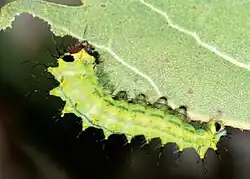 Antheraea yamamai, the Japanese silk moth or Japanese oak silkmoth (Japanese: yamamayu(ga) (山繭(蛾)・ヤママユ(ガ)) or tensan (天蚕)) is a moth of the family Saturniidae. It is endemic to east Asia, but has been imported to Europe for tussar silk production and is now found in southeastern Europe, mainly in Austria, northeastern Italy, and the Balkans. It seems to be spreading north and a population has been reported near Deggendorf and Passau in Germany.[2] The species was first described by Félix Édouard Guérin-Méneville in 1861. It has been hybridized artificially with Antheraea polyphemus of North America.[3]