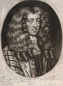 Anthony Ashley Cooper, 1st Earl of Shaftesbury PC, FRS (22 July 1621 – 21 January 1683), was an English statesman and peer. He held senior political office under both the Commonwealth of England and Charles II, serving as Chancellor of the Exchequer from 1661 to 1672 and Lord Chancellor from 1672 to 1673. During the Exclusion Crisis, Shaftesbury headed the movement to bar the Catholic heir, James II, from the royal succession, which is often seen as the origin of the Whig party. He was also a patron of the political philosopher John Locke, with whom Shaftesbury collaborated in writing the Fundamental Constitutions of Carolina in 1669.