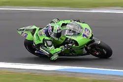 Following the retirement of Olivier Jacque in June 2007, West was offered the position to race with the Kawasaki Racing Team in MotoGP and aboard the Ninja ZX-RR for the remainder of the season, buying out his contract with Yamaha.[7] He made a good debut at the British Grand Prix, reaching fourth position, but then crashing and eventually finishing 11th.[8] His first four races each saw him finish progressively higher, with seventh at Mazda Raceway Laguna Seca and eighth at the Sachsenring.[9] He was seventh again in the wet at Motegi, but could have been even higher. Starting 6th, he jumped the start fractionally – by the time the ride-through penalty was handed out, he was leading the race. Teammate Randy de Puniet came second amidst an all-Bridgestone podium, emphasising the missed opportunity. In his home country's Grand Prix the Australian's error caused him to only finish 12th while compatriot Casey Stoner won aboard his Ducati.