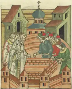 ![]() Bishop Anthony lays the foundation of a church in Novgorod, miniature from the Illustrated Chronicle of Ivan the Terrible (16th century) | |