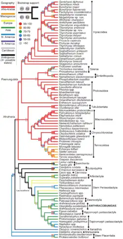 Parsimony analyses consensus tree for phylogeny of anthracobunids from cladistic study by Cooper et al. (2014),[1] showing them (near the bottom) placed within Perissodactyla next to Desmostylia.