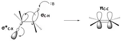 A bimolecular elimination reaction will occur in a molecule where the breaking carbon-hydrogen bond and the leaving group are anti-periplanar[4][5][6][7] (Figure 8). This geometry is preferred because it aligns σC-H and σ*C-X orbitals.[8][9] Figure 9 shows the σC-H orbital and the σ*C-X orbital parallel to each other, allowing the σC-H orbital to donate into the σ*C-X anti-bonding orbital through hyperconjugation. This serves to weaken C-H and C-X bond, both of which are broken in an E2 reaction. It also sets up the molecule to more easily move its σC-H electrons into a πC-C orbital (Figure 10).