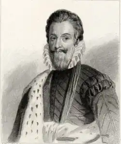 During the reign of Henri, the creation of new chevaliers of the Ordre de Saint-Michel largely ceased. However, he occasionally continued to bestow the honour on his favourites. As such, in 1577, the honour went to the Comte de Brienne and Beauvais-Nangis.[23] During the sixth civil war in 1577, Beauvais-Nangis entered dispute with another favourite of the king, Saint-Luc. Beauvais-Nangis was very reluctant to hand over the command of the Picard regiments to Saint-Luc. He stalled the handover as much as he could, maintaining the command of the regiments during the siege of Brouage in the summer of that year.[22][24] During the Brouage siege, two favourites of Henri—La Guiche and the Comte de Caylus—were captured by a Protestant commander. The men looked to Beauvais-Nangis to secure their release, however he was unable to do so, and they remained in captivity until peace was made three months later.[25] Saint-Luc eventually gave up on acquiring the troops from Beauvais-Nangis and sold the rights to lead the company to Beauvais-Nangis, using the sum he raised from the sale to aid in his purchase of the government of Brouage.[26]