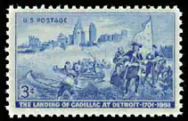 Antoine de la Mothe Cadillac was honored with a 3-cent stamp on July 24, 1951, to commemorate the 250th anniversary of his landing at Detroit in 1701. The stamp's background design depicts Detroit's skyline as it appeared in 1951 and the foreground shows Cadillac's landing at Detroit in 1701.[14]