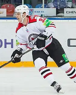 On July 1, 2008, Babchuk re-signed with the Hurricanes to a one-year contract for the 2008–09 season.[6] He led all Hurricanes' defensemen with 16 goals in 72 games. Following a contract dispute that lead to him requesting a trade out of Carolina, Babchuk turned back to Russia on 19 September 2009, re-signing with Kontinental Hockey League (KHL) club Avangard Omsk.[7] During the very first training day in Omsk, he broke the ice rink glass with a shot at Arena Omsk.[8][9]
