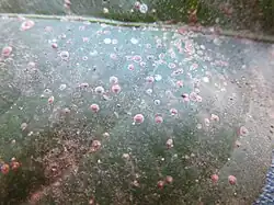 The female scale insect has a circular, brownish-red cover about 1.8 millimetres in diameter. It is firmly attached to the surface when the female is moulting or reproducing. The insect itself is visible through the cover and has an oval body which becomes kidney-shaped at the last instar stage. The female molts twice, exuding the material from which the cover is formed and developing a concentric ring in the center each time.[3] There is a characteristic whitish coating on the underside of the body which separates it from the host plant.[4] The female is viviparous with the eggs hatching internally.[5] She produces 100 to 150 young altogether and live nymphs or crawlers emerge from under their mother's cover at the rate of two to three per day. When they first hatch the nymphs are a yellowish color and search for a suitable place to settle in depressions on twigs, leaves or fruits. They then start feeding by inserting their mouthparts deep into the plant tissue and sucking sap from the parenchyma cells. The saliva they inject is very toxic to the leaves, twigs, branches and fruit of citrus trees.[6] They soon begin to develop their own round, waxy covers.[3]