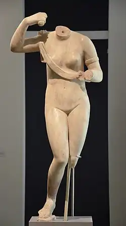 It is believed that the warlike depiction of Aphrodite belongs to her very earliest acolytes and cults in Cyprus and Cythera, where there was a strong eastern influence during the Orientalizing Period.[3] This depiction can trace Aphrodite's descent from older Middle Eastern goddesses such as the Sumerian Inanna, Mesopotamian Ishtar, and Phoenician Astarte.[4][5] In Cyprus, Aphrodite was also referred to by the epithet "Aphrodite Encheios" (Aphrodite with a spear), and it has been suggested that the cult was brought from Cyprus to Sparta.[3] She was also known by this name on the Areopagus and at Corinth.[6]