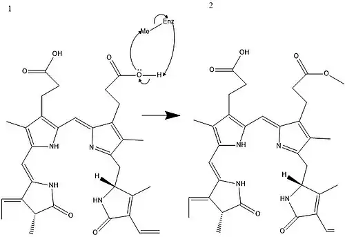 - ^ Rüdiger, Wolfhart; O'Carra, Pádraig (1969). "Studies on the Structures and Apoprotein Linkages of the Phycobilins". European Journal of Biochemistry. 7 (4): 509–516. doi:10.1111/j.1432-1033.1969.tb19637.x. PMID 5776242.
