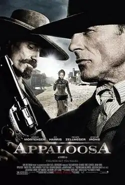 Appaloosa is a 2008 American Western film based on the 2005 novel Appaloosa by crime writer Robert B. Parker. Directed by Ed Harris and co-written by Harris and Robert Knott, Appaloosa stars Harris alongside Viggo Mortensen, Renée Zellweger, and Jeremy Irons. The film premiered at 2008 Toronto International Film Festival and was released in selected cities on September 19, 2008, then expanded into wide release on October 3, 2008. This movie has won four different awards, including the Western Heritage Award in 2009.[2]