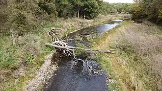 The river canyon is part of the Driftless Area of Illinois, a region that was bypassed by the last ice age; "the glacial sweep which ironed out hills and filled valleys in other parts of the state left this area unscratched".[2] During the dramatic events that surrounded the end of the last Ice Age, the Apple River, which once flowed eastward into the Pecatonica River, reversed its original course and began to flow southwest through an erosion gorge to the Mississippi. The result is a deep canyon, part of which is preserved in the Park.[3] Loess covered the landscape and the soils that developed on it are mapped as Lacrescent silty clay loam and Dubuque silt loam.[4]