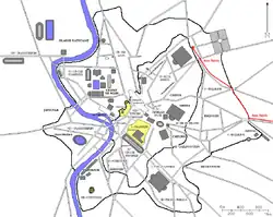 From here on the conduit used the Aurelian Walls and crossed Via Tiburtina on an arch which became Porta Tiburtina. The route passed the Viminal gate, where Termini Station stands today, and ended near the Porta Collina, where the main distribution castellum was, near the current Via XX Settembre. It passed through 14 castella delivering water to four regions.[7]