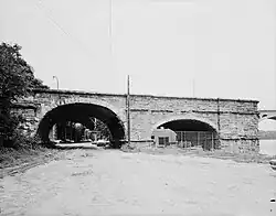 In 1830, merchants from Alexandria, Virginia, which was still part of the District of Columbia at the time, proposed linking their city to Georgetown to capitalize on the new Chesapeake and Ohio Canal.[1] Congress granted a charter to the Alexandria Canal Company in 1830,[2] and construction soon began on the Aqueduct Bridge that would carry canal boats across the Potomac River and downriver on the south side without unloading in Georgetown. The bridge was designed by Major William Turnbull.[3] Construction of the bridge and Alexandria Canal began in 1833, and both were completed in 1843.[3] To withstand Potomac ice floes, the piers were made of gneiss, with icebreakers made of granite.[4] The water-filled bridge was a weatherproofed-timber, queen-post truss construction.[5] The bridge was 110 feet (33.5 m) wide across the top. It had eight piers, each set on riverbottom bedrock and 7 feet (2.1 m) wide at the top. The third and sixth piers were 16 feet (4.9 m) wide at the top. Each pier was designed so that its top was 30 feet (9.1 m) above the mean high water level.[4] A narrow carriageway ran alongside the bridge. Later, a separate level for pedestrian and carriage traffic was added to the bridge. The tolls from the addition inhibited trade between Georgetown and Virginia, thus benefiting Alexandrian businessmen who retained Virginian trade.[6]